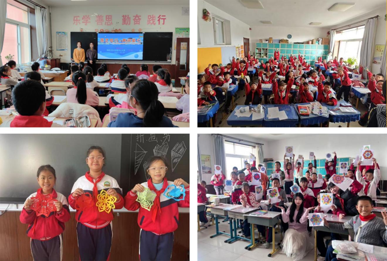 本次美育浸润课程形式包括创意石头画、树叶的色彩魔法、曼陀罗艺术、藻井艺术、窗花艺术、庄河剪纸传承以及蓝晒艺术等,与我校艺术专业教育所秉承的艺术生活化、传统美学活化、医艺跨界应用等理念相贴合,兼顾艺术普及的趣味性,也体现了高校艺术教育的专业性与独特性。一张彩纸、一支画笔、一块石头……都成为孩子们表达自我的艺术媒介。课堂上,孩子们专注的眼神、雀跃的欢呼与自豪的作品展示,构成了美育最本真的模样。
